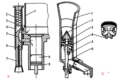圖b是灌裝機中錐形閥定量泵的結構圖。具有錐形口的料斗1充滿粘性產品,并且在料斗的中部安裝了一個活塞。活塞由活塞主體3和活塞框架4組成,并套在活塞桿6上。當活塞桿6在偏心輪的推動下開始向上移動時,活塞停止。僅當固定在活塞桿6上的定位套筒5上升以接觸活塞框架4時,活塞才隨桿向上移動。連接到活塞桿6上部的錐形閥2隨活塞桿向上移動并離開活塞體3,從而允許活塞的上部和下部連通。物料通過活塞3和閥2之間的間隙流入下部空間;當活塞6開始下降時,由于活塞的下部充滿了物料,因此活塞保持平衡。當閥2與活塞體3接觸時,即使閥2關閉,它也可以向下驅動活塞以將材料推出排出口并填充容器。活塞往復運動一次以完成一次填充。可以通過改變活塞沖程來調節填充量,誤差小于2%。